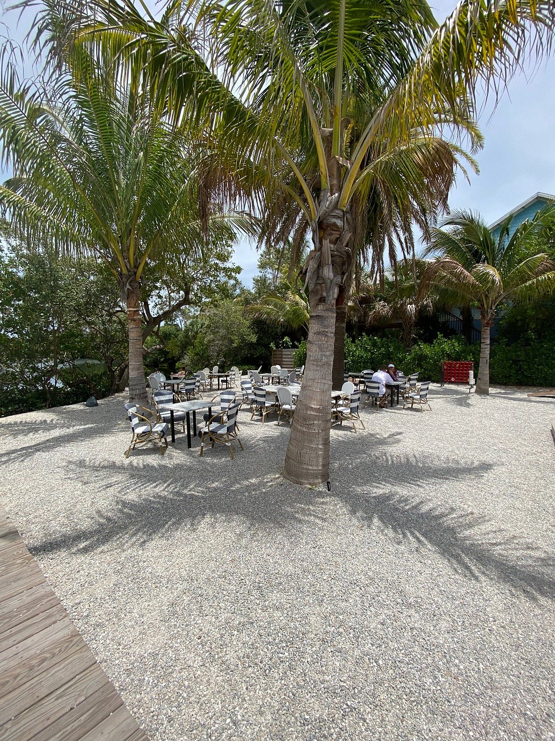 Dine Bayfront among Century-old button wood trees.